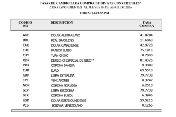 El Banco Central de la República Dominicana estableció la tasa oficial del dólar estadounidense al cierre del 9 de abril de 2026 en RD$59.5216 para la compra y RD$60.4890 para la venta, niveles que servirán como referencia para las operaciones cambiarias hasta el 10 de abril.